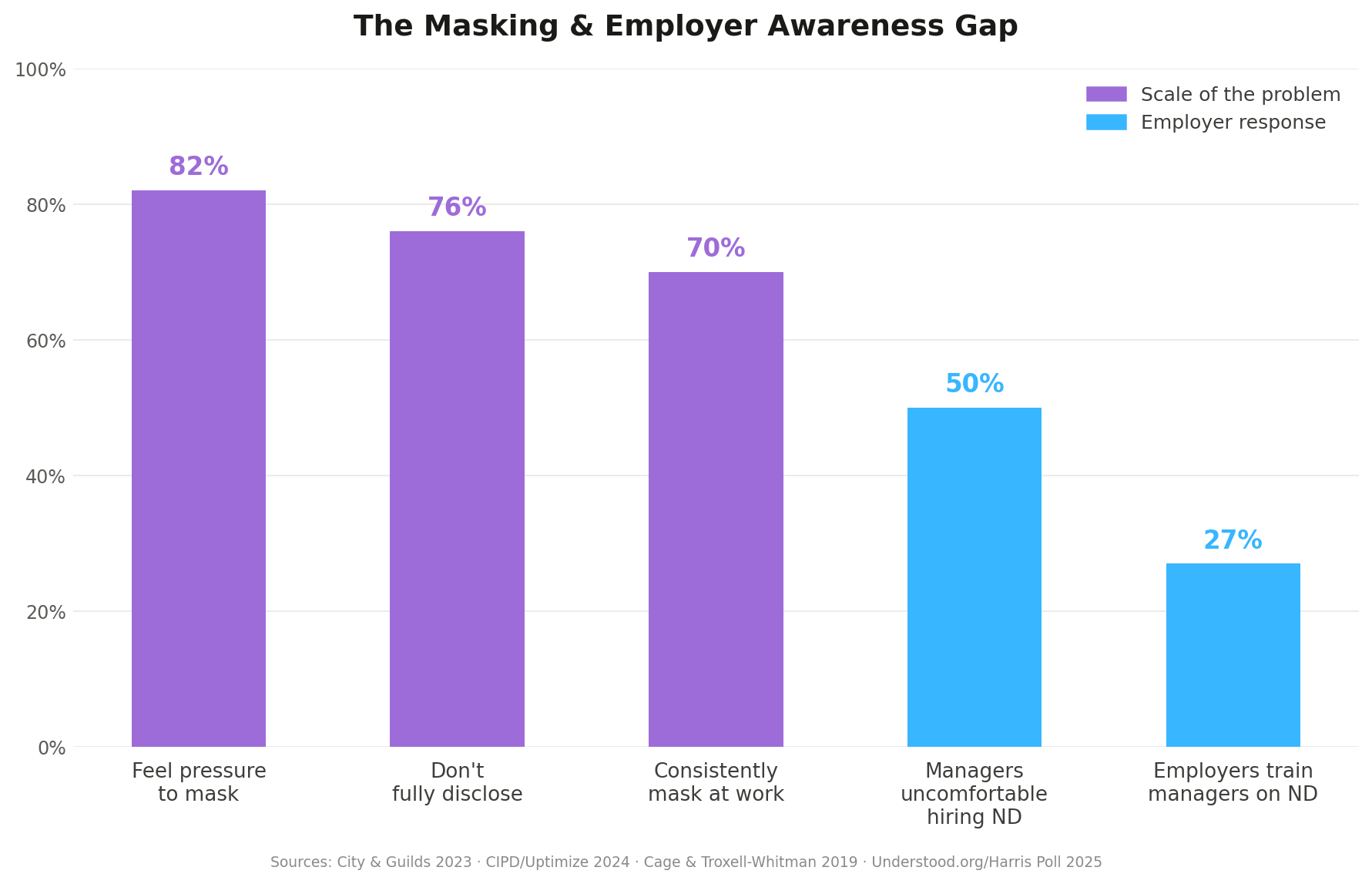 Neurodivergent employees are 45% more likely to report feeling exhausted at work compared to their neurotypical colleagues (CIPD/Uptimize, 2024). 51% have taken time off due to their condition (City & Guilds, 2025).